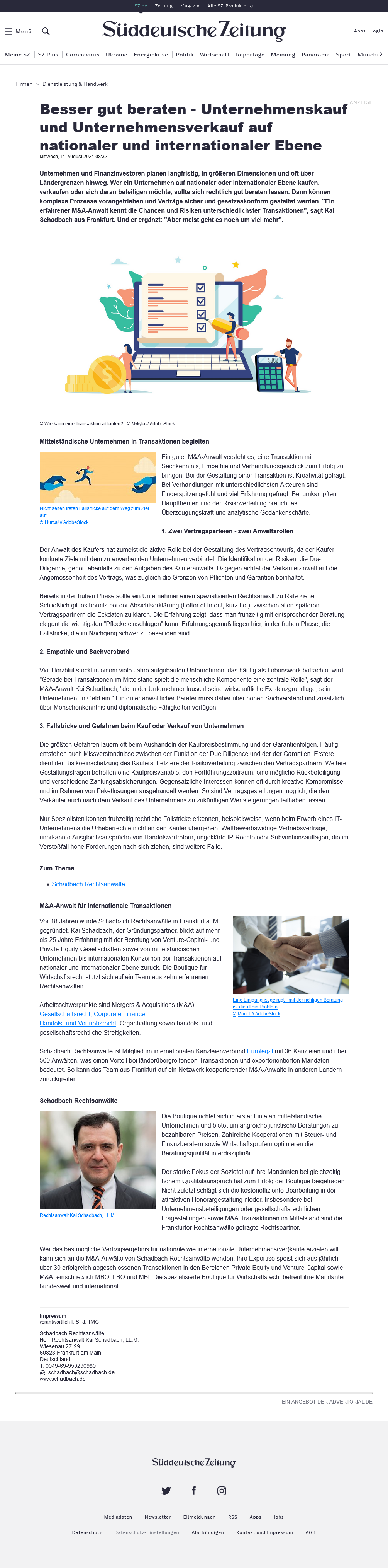 - Schadbach: „Welchen Nutzen bringt der (richtige) Rechtsanwalt beim Unternehmensverkauf?“ FOCUS online, 11. August 2021